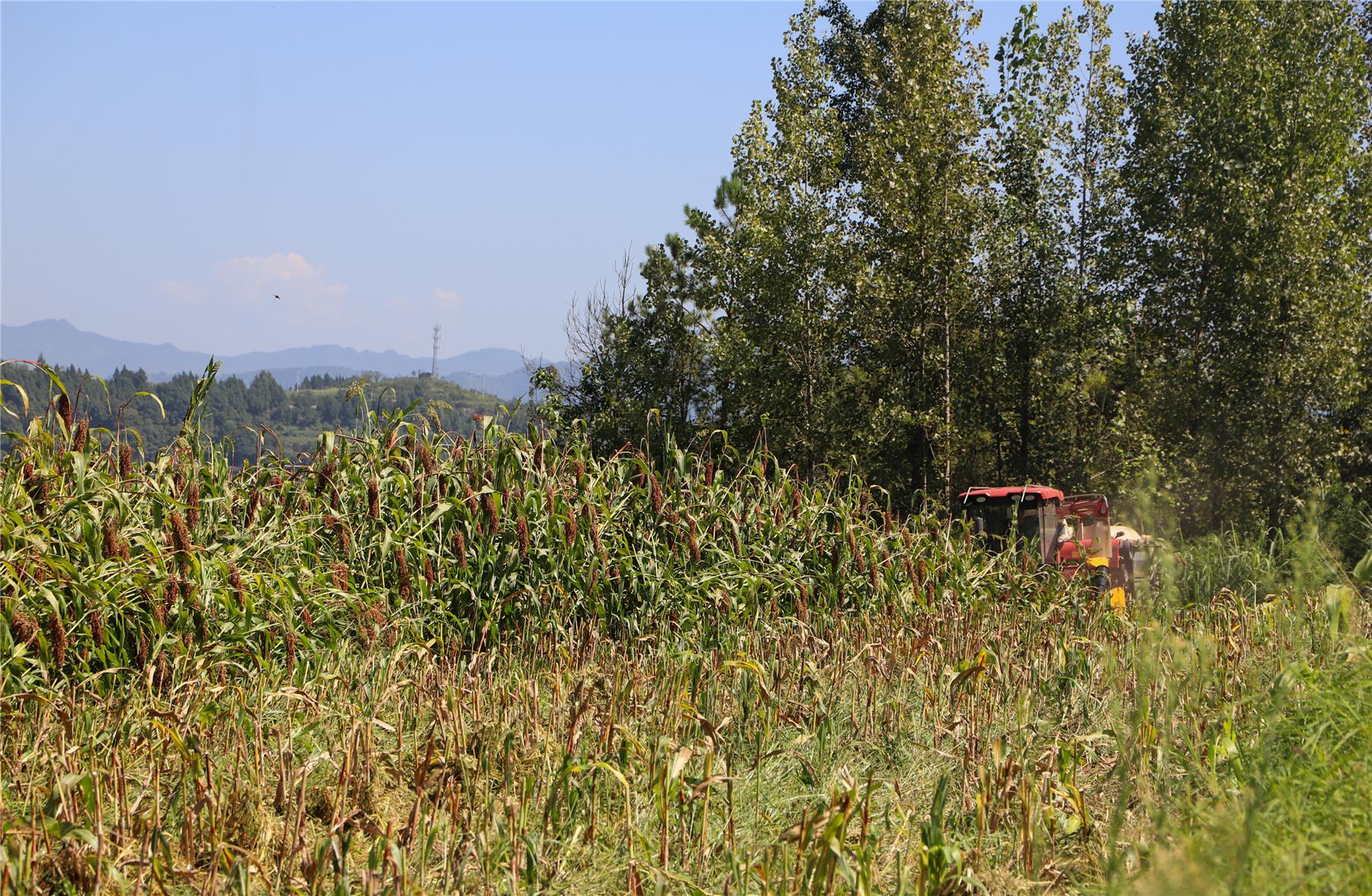 8月14日,在云陽縣寶坪鎮棗樹村的高粱基地里,紅彤彤的紅纓子高粱迎風搖曳,一串串紅高粱穗粒飽滿。層層疊疊,隨風搖曳,在藍天白云的映襯之下格外亮眼。高粱種植大戶向曉陽趁著晴好天氣抓緊收割高粱,伴隨著“隆隆”的轟鳴聲,收割機在田間來回穿梭作業,將一株株高粱連稈帶穗卷入其中,收割、摘穗、脫粒、秸稈粉碎一氣呵成,田野間處處洋溢著豐收的味道。