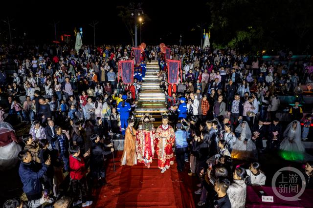 “鳳冠霞帔的中式婚禮,是不少女孩子的夢中婚禮,以前只在電視上過,今天現實看到的不一樣,更震撼更漂亮,感受到了溫馨,也很快樂。”市民王懿全程跟著花轎游園,眼前的中式婚禮讓她眼前大亮,現場不少觀眾也紛紛拿出手機拍照留存。