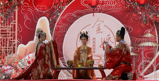 國潮婚典秀生動再現了傳統婚俗文化中梳妝禮、沃盥禮、同牢禮、合巹禮、婚禮、執手禮等禮儀環節,向在場觀眾呈現了一場跨越時空的婚禮盛宴。