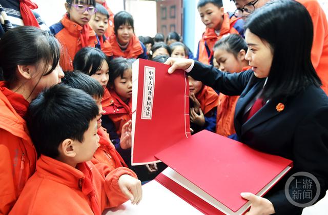 普法干警為孩子們打開《中華人民共和國憲法》宣誓本,聆聽憲法誓詞的精準內涵和所代表的價值觀。