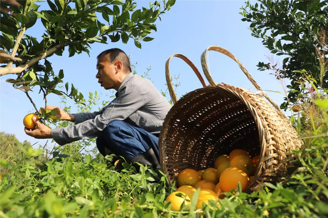 在柑橘種植戶趙小平的果園,熹微的陽光將樹影拉得修長,滿樹圓潤飽滿的“小金果”為滿目碧色增添了耀眼的點綴。趙小平手持剪刀,輕輕一剪,再將一顆顆“小金果”輕輕放入簍中,整個過程都充滿了對果實的愛護。