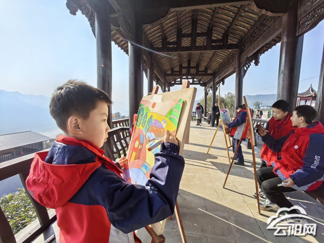 果園里,在果農的指導下,少先隊員們分組有序地開始了愉快的采摘活動。他們興奮地穿梭在柑橘樹間,仔細挑選成熟的柑橘,小心翼翼地摘下來放入籃子中。當一筐筐柑橘裝滿竹籃時,走在返回的路上,他們的臉上笑開了花。同時,小小志愿者還進行了“愛我家鄉(xiāng)美”主題寫生活動。繪畫中,大家走進桃源人家,了解了家鄉(xiāng)獨特的自然生態(tài)景觀。在半山腰的蘆枝長廊里,小小志愿者欣賞了新農村建設、生態(tài)莊園和長江美景,然后開始用筆墨描繪了和美鄉(xiāng)村畫圖,并將歷史的、文化的韻味融合到畫作里。