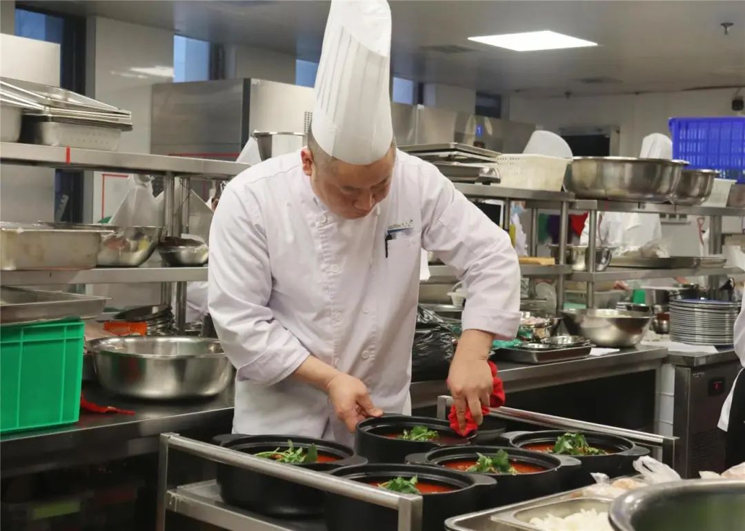“今年酒店的團年飯大概2000桌,這就需要提前規劃好所有東西。”面對如此龐大且復雜的工程,對王強和他的團隊來說,無疑是一場巨大的挑戰。為確保每一位顧客都能品嘗到美味佳肴,王強需要提前把握好每一個細節,把控好上菜節奏。既不能讓顧客等太久,又不能讓菜品一股腦全上,要讓每一道菜都保持最佳的“鍋氣”與口感。