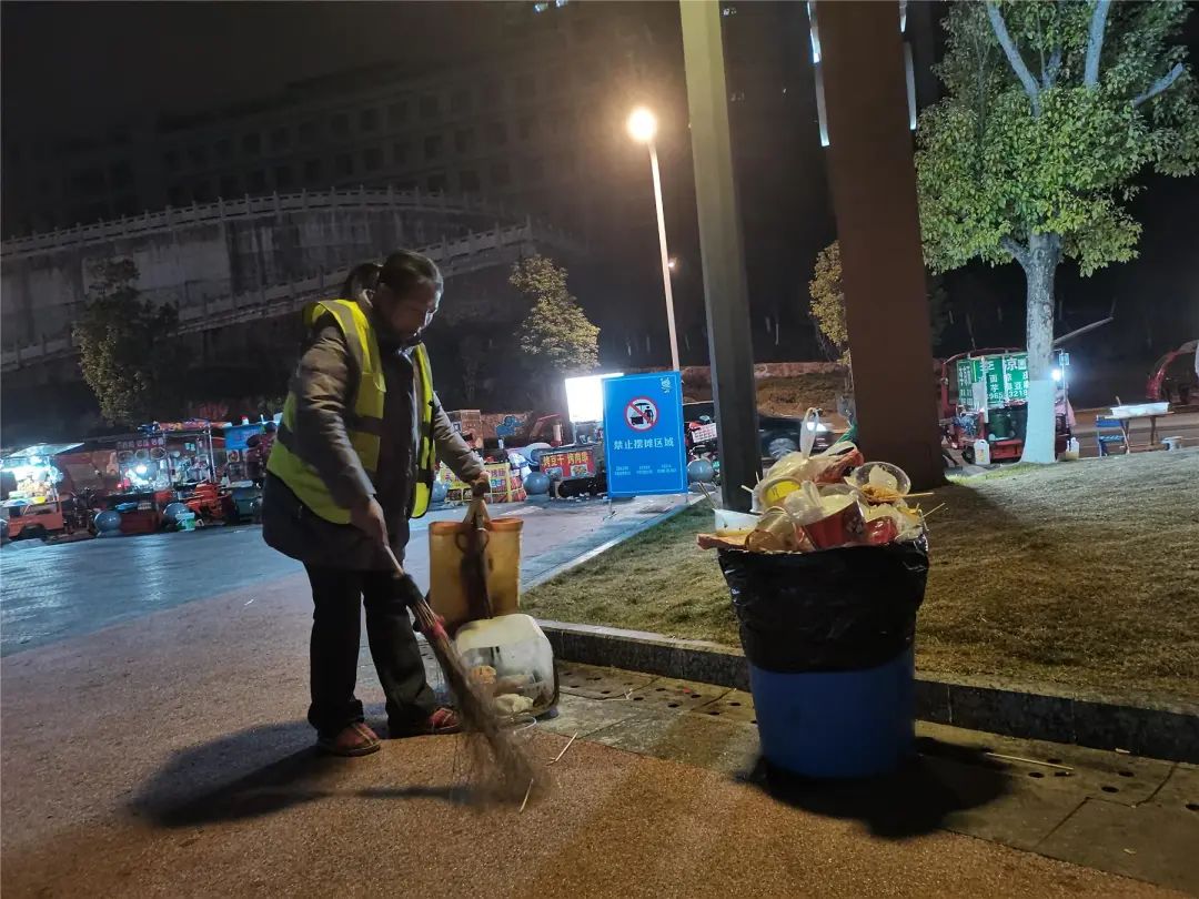 王先菊負責的區域是云頂廣場,這里因為新年登梯望遠的傳統習俗而聚集了大量市民。春節期間,人流量和車流量的增加使得保潔工作強度比平時大了不少。然而,王先菊從未有過怨言。每天凌晨五點多,她就開始了一天的工作,一直忙碌到夜幕降臨。