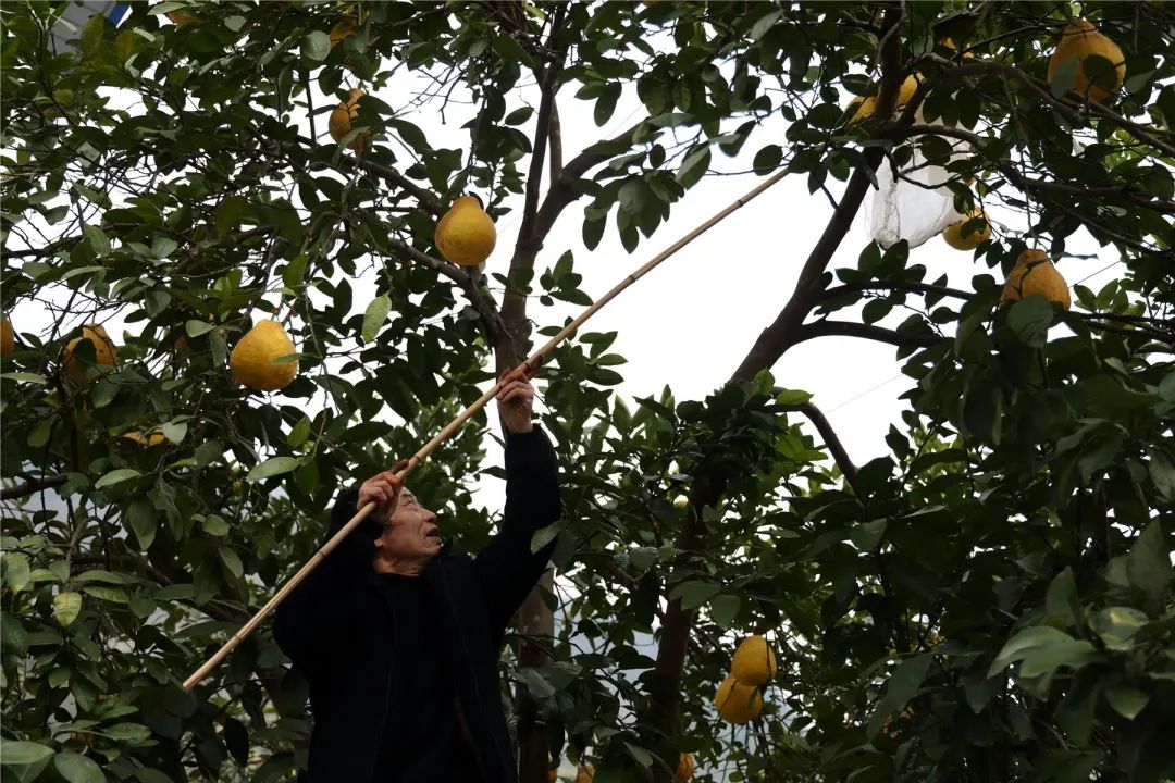 周本春又拿了袋子與孫子一起走到柚子樹旁