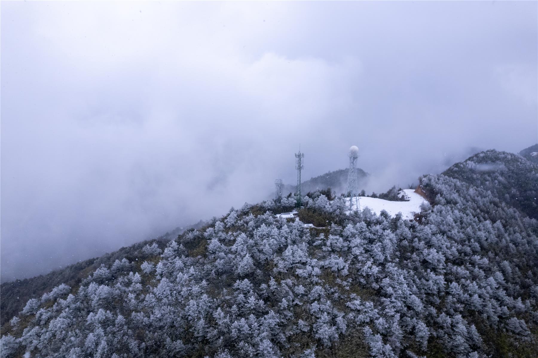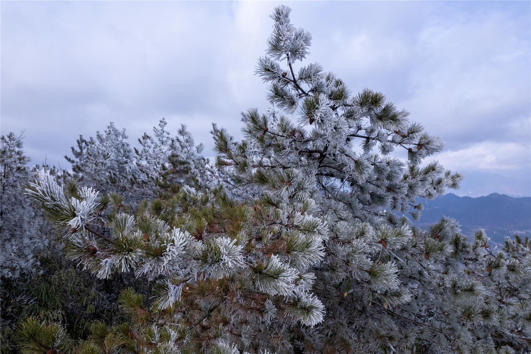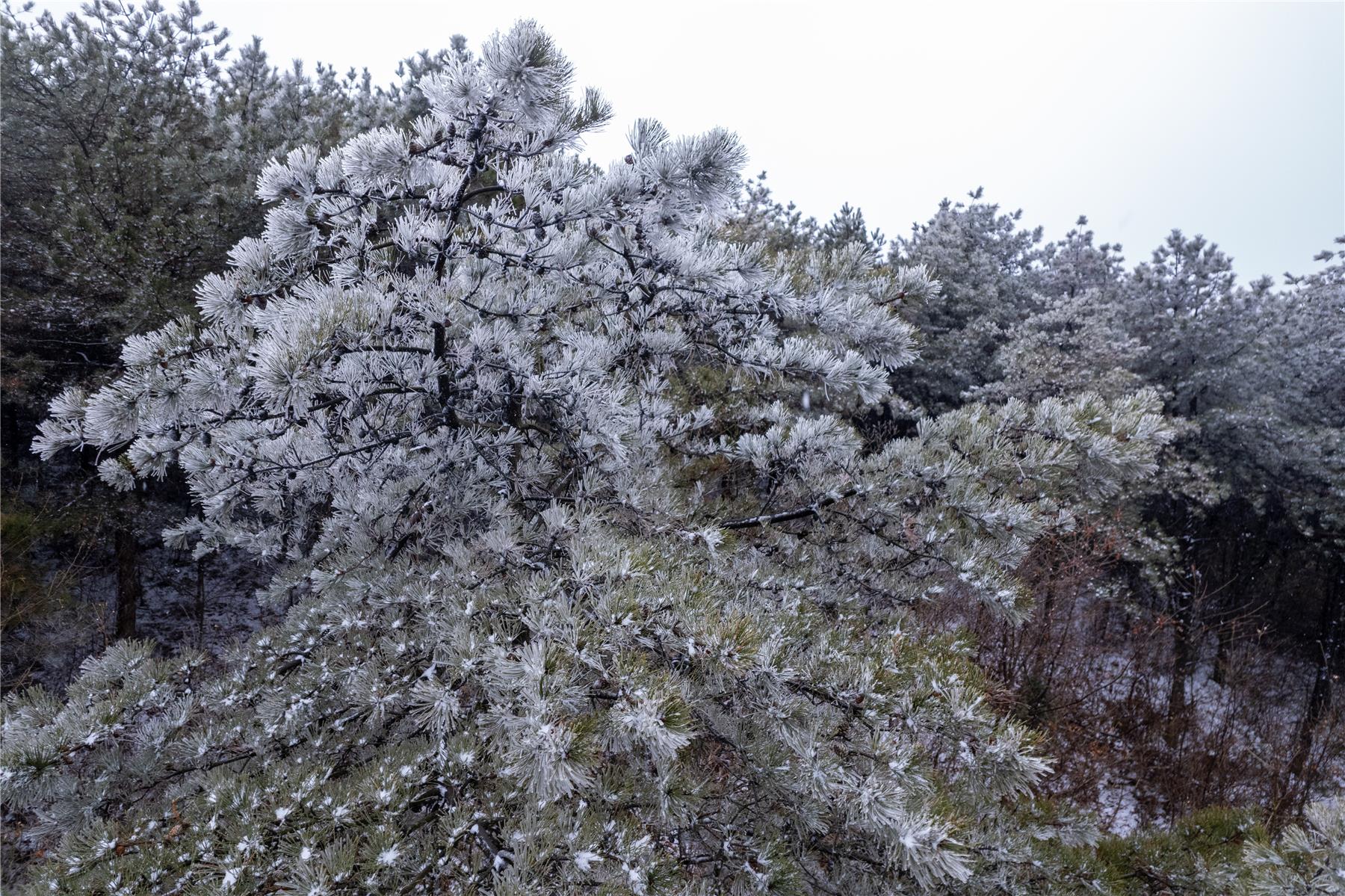 經(jīng)過一夜的風吹霧漫,在海拔1700米以上的鑼鼓宕景區(qū),遠遠望去已是一片銀裝素裹。雪白的冰晶附著在漫山遍野的樹枝上,呈現(xiàn)出霧凇景觀,簇簇松針,如銀菊怒放,造型奇特的灌木,如海底珊瑚,將整個山巔妝點得如同一幅水墨山水畫。不少的游客紛至沓來,拍照賞景。