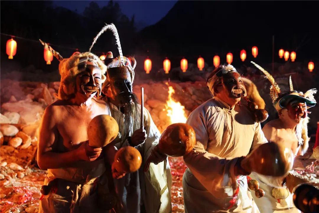 夜幕降臨,色彩斑斕的儺戲演員們身著傳統服飾,佩戴形狀各異的面具,在熊熊燃燒的火堆映照下,踏著強烈的鼓點,伴隨著戲文朗誦與舞蹈,演繹著千年傳承的神秘儀式,展現出威嚴而震撼的場面。