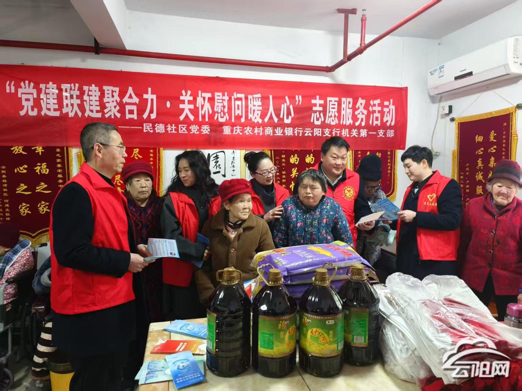 云陽網訊(記者 丁鑫)3月10日,青龍街道民德社區攜手重慶農村商業銀行云陽支行機關第一黨支部,共同走進了“溫馨之家”養老院,舉辦了一場以“黨建聯建聚合力、關懷慰問暖人心”為主題的志愿服務活動。