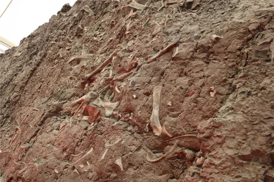 2014年,普安鄉老君村一名年輕人意外發現了恐龍化石的蹤跡,自此揭開了這片“龍鄉秘境”的面紗。經過多年挖掘,研究人員發現了世界上最大的侏羅紀恐龍化石墻:150米,高6米到10米、埋藏深度至少20米,展布面積達到1320平方米,近5000塊化石密集鑲嵌,涵蓋頭骨、牙齒、椎體等骨骼,涵蓋蜥腳型類、獸腳類、鳥腳類、劍龍類、基干新鳥臀類五大類恐龍化石,近百條恐龍在此長眠,構成了一個完整的恐龍群落。
