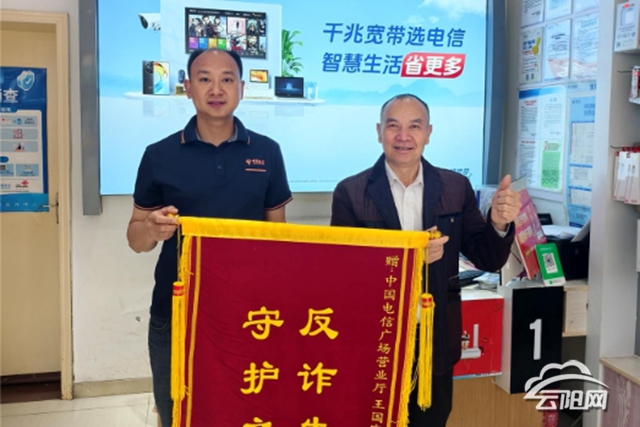 云陽網(wǎng)訊(通訊員 余靜 黃雷)近日,云陽縣一名群眾將一面印有“反詐先鋒 守護(hù)之神”的錦旗,送到了中國電信棲霞支局門店老板王國富的手中。