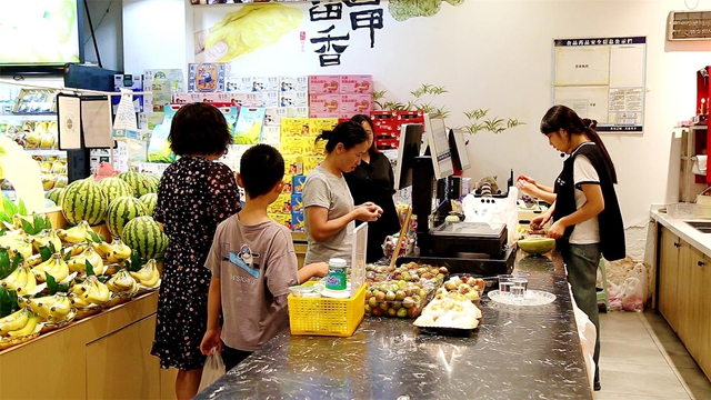 在水果供應方面,超市成為重要渠道。重百超市生鮮經理解維菊介紹,夏季是多數水果的豐收期,市場供應量大增,豐富的品類和充足的貨源使得水果價格下跌。以山竹和荔枝為例,山竹價格從原先的15.8元/斤降至9.9元/斤,荔枝價格從12.9元/斤直降到6.98元/斤,榴蓮、西瓜等熱門水果也紛紛“降價促銷”。價格的下降帶來銷量的顯著增長,不少市民趁著實惠大量采購。