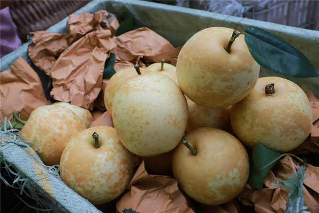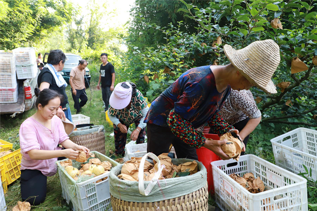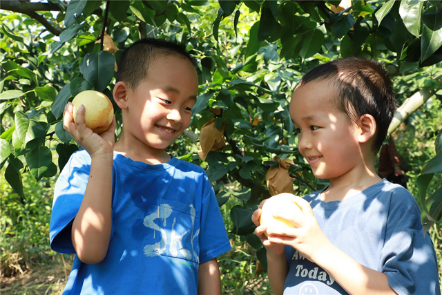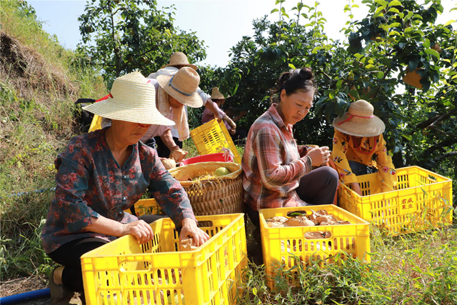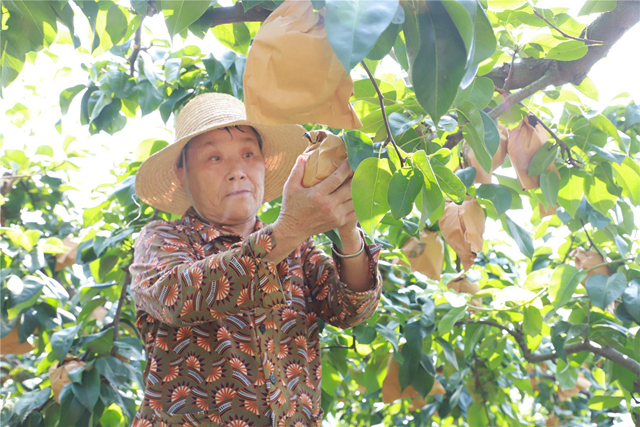 走進基地,梨樹枝繁葉茂,顆顆飽滿的翠冠梨綴滿枝頭,在陽光映照下泛著誘人的光澤,清甜的果香在空氣中浮動。果農們嫻熟地采摘著成熟的果實,豐收的喜悅洋溢在田間。“土地流轉了四五畝,在這里做工一天能掙百把塊,一年收入一兩萬,還能顧上家。”果農陳明書的話語道出了這份家門口增收的滿足。