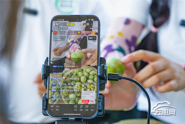 龍角鎮(zhèn)木甫村海拔適中,日照充足,產(chǎn)出的青脆李皮薄肉厚、酸甜爽脆。今年,當?shù)匾?guī)模化種植青脆李約600畝,年產(chǎn)量預(yù)計可達5萬斤左右。為幫助農(nóng)戶拓寬銷售渠道,龍角鎮(zhèn)政府聯(lián)合“云陽村播助農(nóng)團”直播團隊開展電商銷售,組織本當?shù)馗刹可钊胩镩g地頭,化身主播,把手機變?yōu)椤靶罗r(nóng)具”,讓新鮮采摘的李子通過互聯(lián)網(wǎng)賣到全國各地。