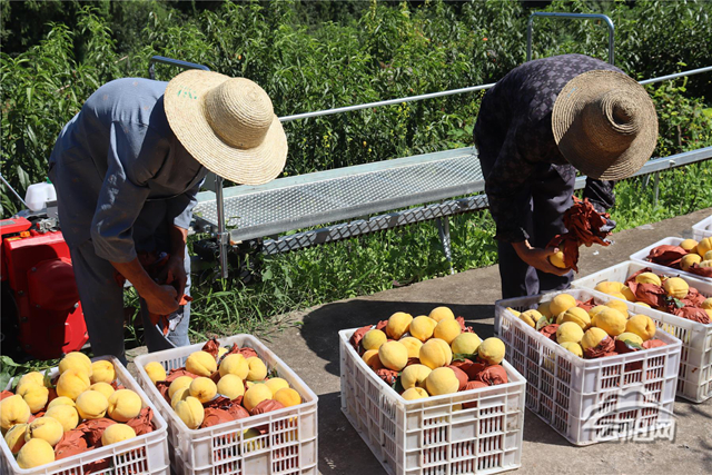走進永高村黃桃產業園,飽滿的黃桃綴滿枝頭,果皮泛著誘人的紅暈。果農們穿梭在林間,小心翼翼地將成熟果實摘入筐中。不遠處,一條單軌順著山地起伏延伸,裝滿黃桃的果筐被穩穩固定在軌道車上,隨著操作指令啟動,“小火車”沿著軌道緩緩向公路邊駛去,短短幾分鐘便抵達目的地,整個過程高效又平穩。