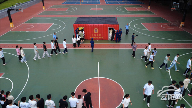 隨著火災警報聲的響起,教學樓內瞬間“濃煙彌漫”。各班級學生在老師的引導下,迅速捂住口鼻、彎腰低姿沿指定疏散路線向操場安全區域撤離,整個疏散過程緊張而有序。