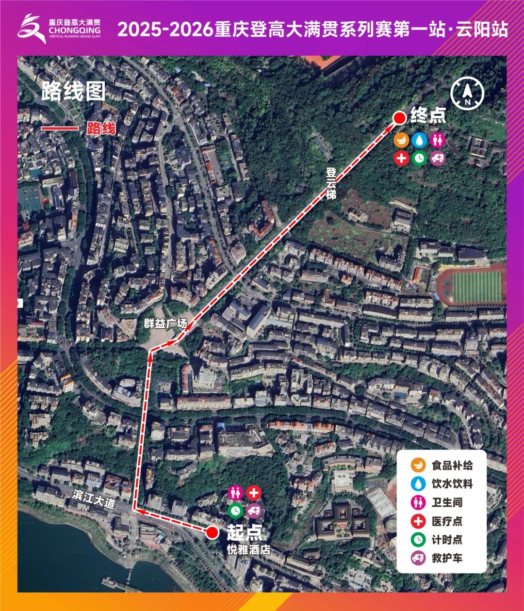 選手完賽下撤路線:峽梯城云頂廣場沿梨園路步行2.3公里返回。