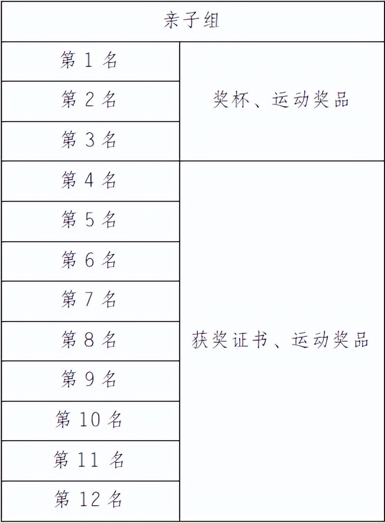 親子組成績以槍聲成績錄取前三名,其余名次按凈計時錄取。親子組最終成績以該組最后一名選手越過終點線的為準,該時間即為本組的完賽時間。前3名現場安排頒獎儀式,獎勵見下表: