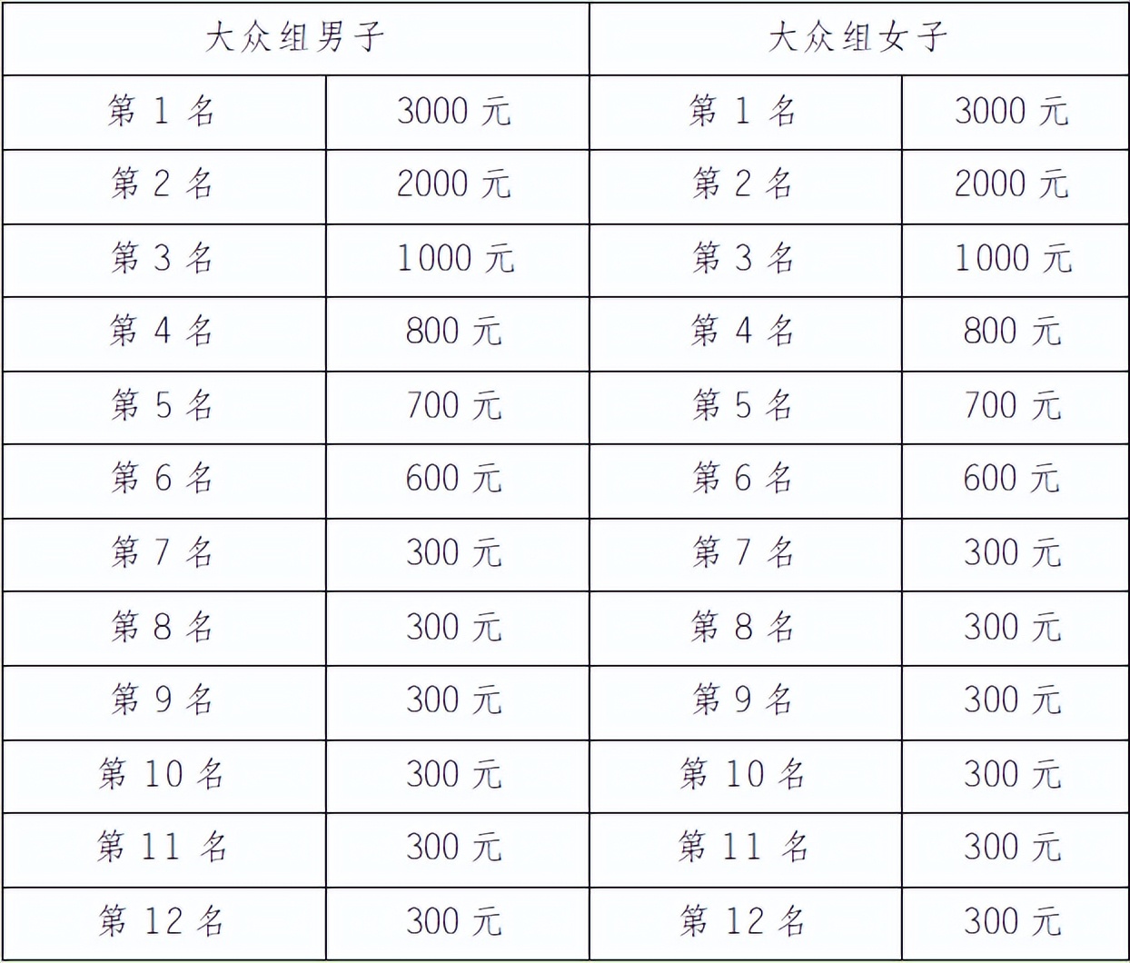 大眾組成績以槍聲成績錄取男/女前三名,其余名次按凈計時錄取,男、女前三名安排頒獎儀式。獎金見下表(單位:人民幣/元):