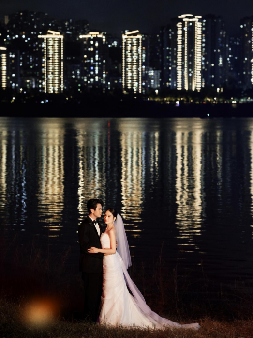 以“自然與現代的碰撞”為主題,融合透明婚禮亭、霓虹燈墻、熒光夜拍等都市元素,打造兼具浪漫與潮流的時尚婚紗大片。