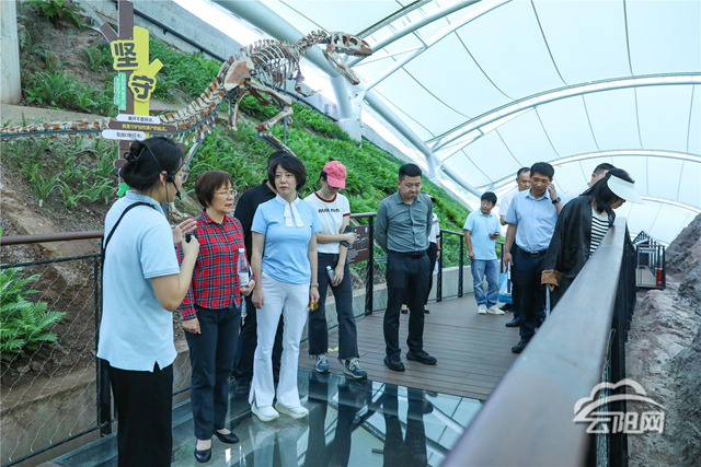 調研期間,雷涯鄰書記一行參觀了遺址館內的恐龍化石墻,認真聽取了關于化石群發現過程、保護措施、科研進展及科普展示情況的詳細介紹,并深入了解云陽恐龍國家地質公園“兩館三中心”的整體規劃與建設進展。雷涯鄰對云陽保存有規模如此宏大、具有國際意義的恐龍化石群表示高度贊賞,并對云陽世界地質公園在化石原位保護、科學研究與公眾教育等方面取得的成效給予充分肯定。
