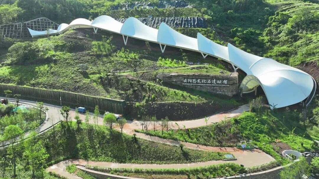 云陽恐龍化石遺址館擁有全球單體規模最大的侏羅紀原址化石墻,長150米、高6米的恐龍化石墻上,近5000塊化石密集鑲嵌,涵蓋頭骨、牙齒、椎體等骨骼,涵蓋蜥腳型類、獸腳類、鳥腳類、劍龍類、基干新鳥臀類五大類恐龍化石,近百條恐龍在此長眠,構成了一個完整的恐龍群落。