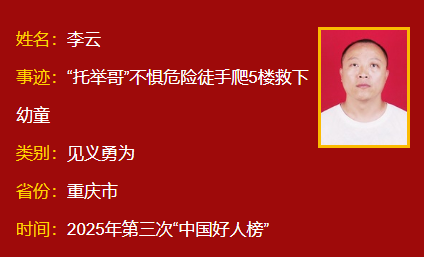 李云,男,1981年9月生,重慶市云陽縣普安鄉馬安社區居民。2025年4月8日,四川省廣漢市某小區,一名幼童頭部被卡在5樓防盜窗縫隙中,身子懸在半空,命懸一線。