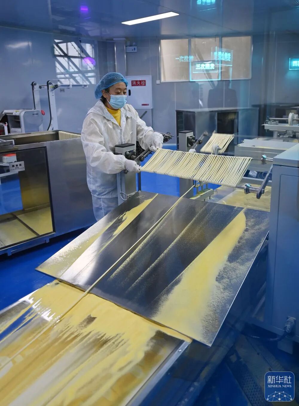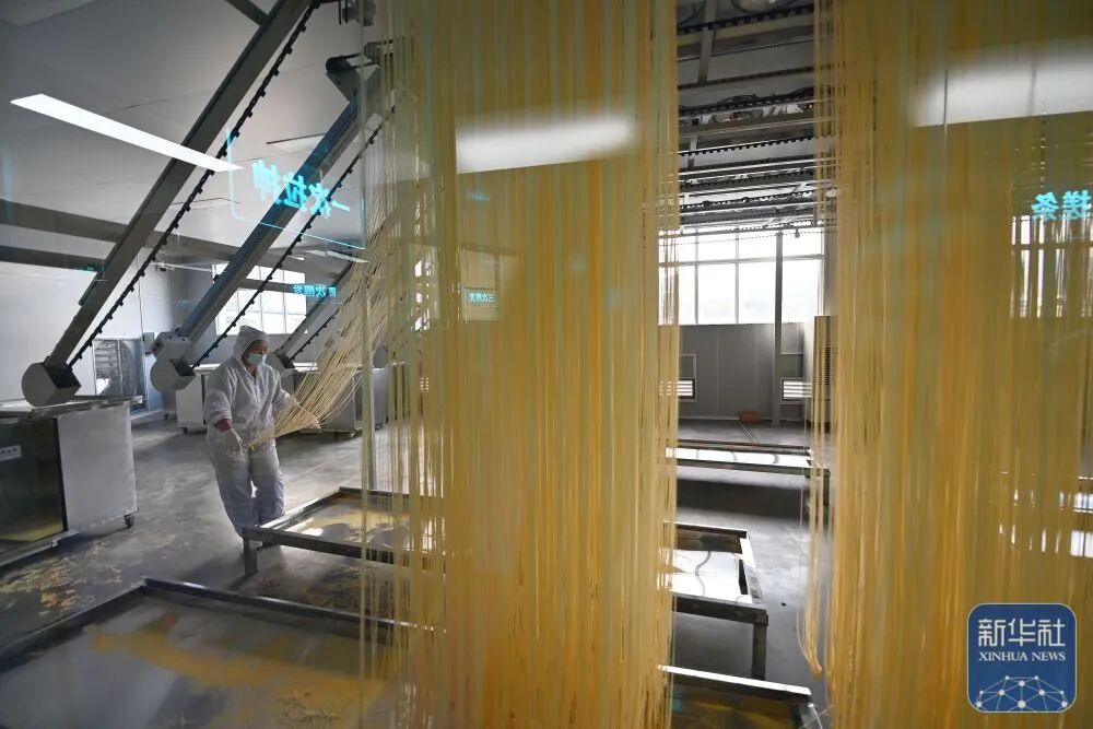 ↑ 11月4日,在巴陽杠子面生產工廠,工作人員將面條“盤條上桿”。巴陽杠子面是重慶市云陽縣的傳統面食之一,發源于巴陽峽兩岸,以竹杠壓面工藝和獨特口感著稱。