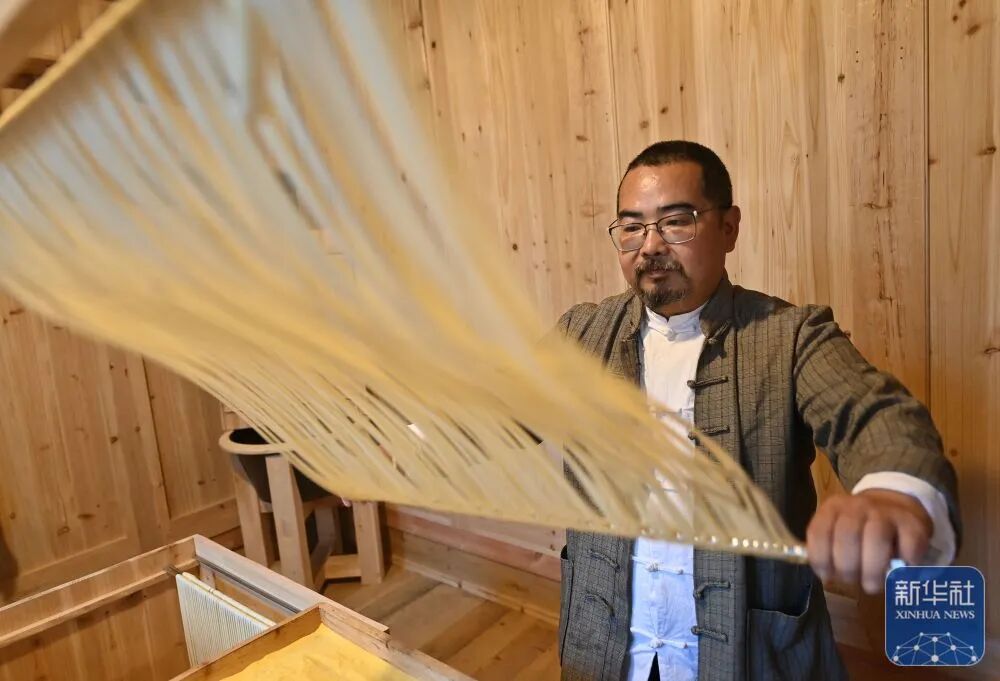 ↑ 11月5日,喜禾麥面業創始人宋喜在重慶市云陽縣喜禾麥面業的標準作坊制作面條。1989年出生的宋喜從銀行辭職,于2024年開始創業做喜禾麥面業。