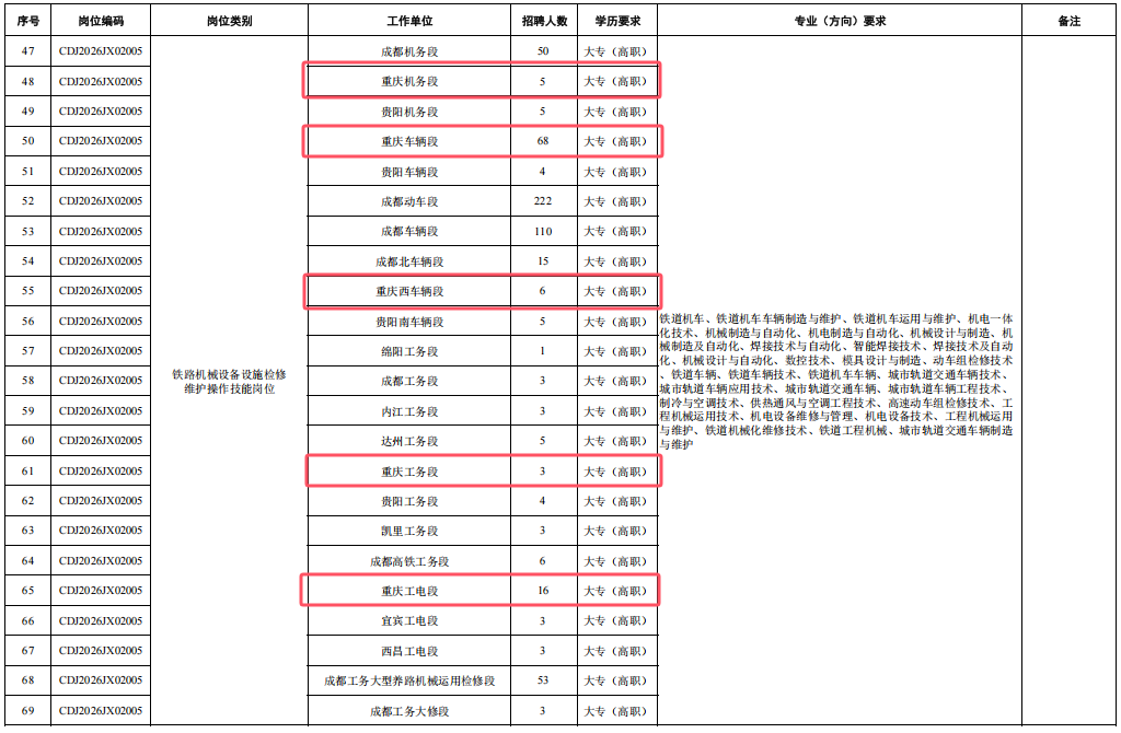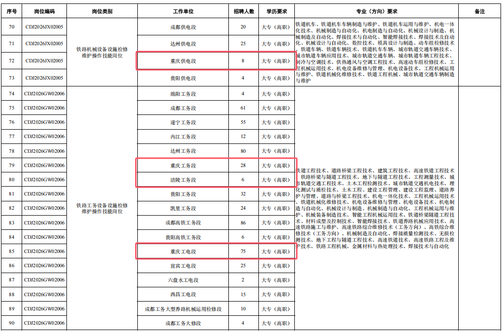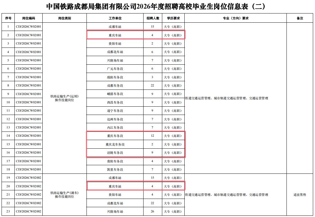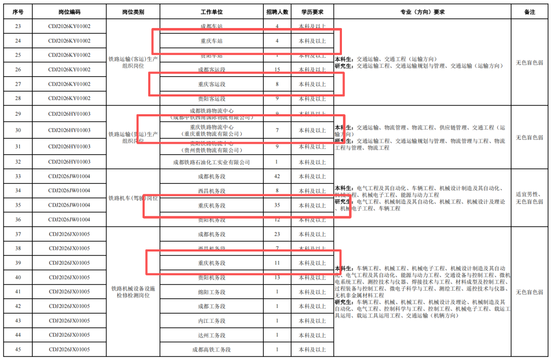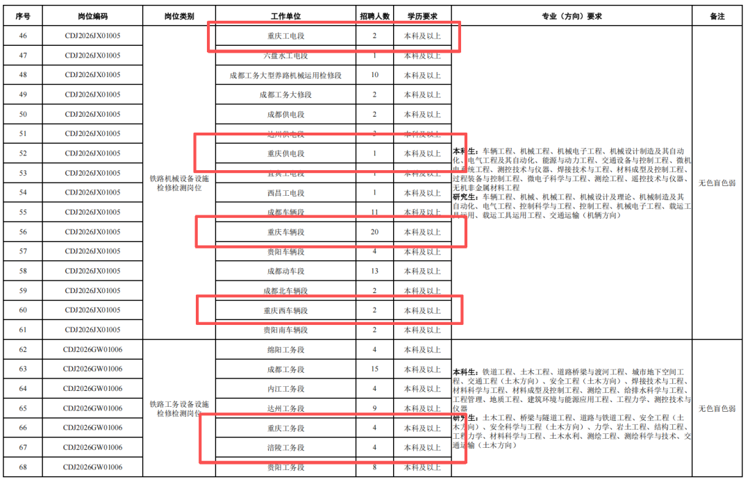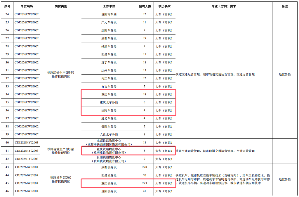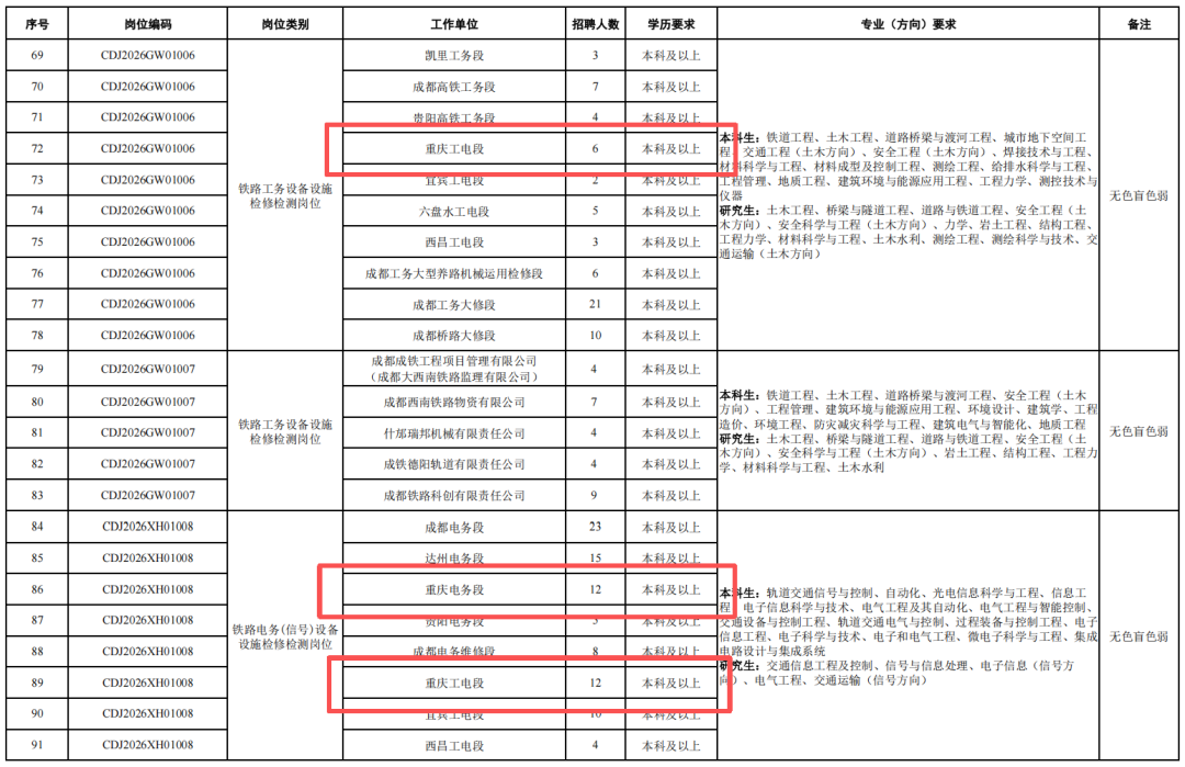 4.身心健康,具有良好的心理素質(zhì),聽力、視力良好,辨色力正常,無色盲色弱,具備正常履行崗位職責(zé)的身體條件,符合招聘崗位職業(yè)健康規(guī)范標(biāo)準(zhǔn)。其中崗位編碼為CDJ2026JW02004崗位,要求身體條件符合《鐵路機(jī)車車輛駕駛?cè)藛T健康檢查規(guī)范》(TB/T3091-2019)規(guī)定標(biāo)準(zhǔn)。