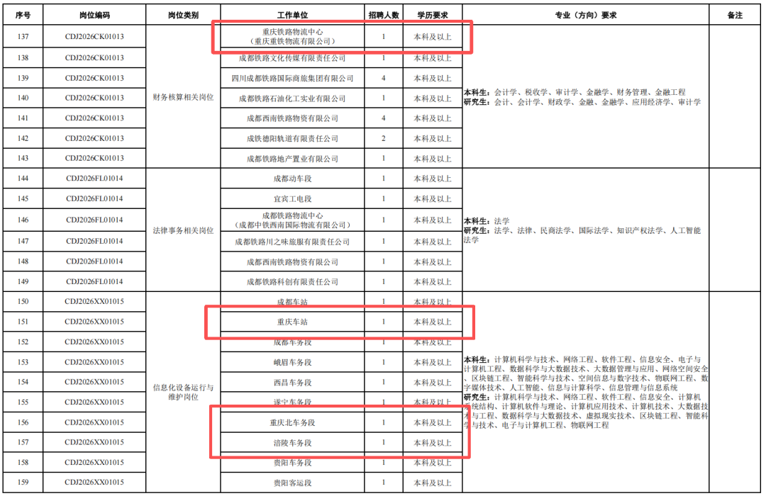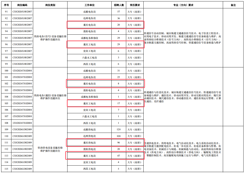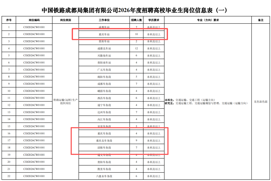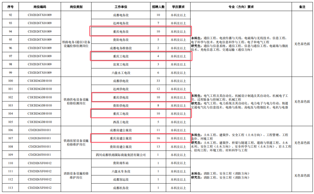 4.身心健康,具有良好的心理素質(zhì),聽力、視力良好,部分崗位要求無色盲色弱,具備正常履行崗位職責(zé)的身體條件,符合招聘崗位職業(yè)健康規(guī)范標(biāo)準(zhǔn)。其中崗位編碼為CDJ2026JW01004崗位,要求身體條件符合《鐵路機(jī)車車輛駕駛?cè)藛T健康檢查規(guī)范》(TB/T3091-2019)規(guī)定標(biāo)準(zhǔn)。