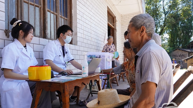 “你這個血壓控制得不錯,平時高血壓藥要繼續按時吃。這幾天天氣炎熱,一定要注意防暑。”在蘭草村,故陵鎮中心衛生院全科醫生方思滿一邊為蘭草村村民李尚玖測量血壓,一邊耐心叮囑道。