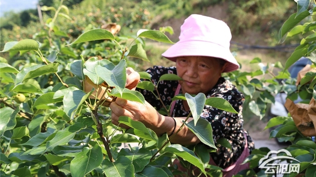 眼下正值翠冠梨管護關鍵期,云陽縣平安鎮平安社區500畝翠冠梨種植基地里,果農們正搶抓農時,為梨果套上特制紙袋,一派繁忙的勞作景象。
