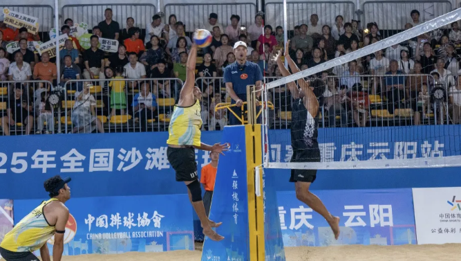 長江之畔,陽光沙灘,燈光璀璨5月29日晚2025年全國沙灘排球巡回賽(重慶云陽站)正在進行運動員們在沙灘上展開激烈角逐發球、跳躍、扣球等精彩動作引來觀眾陣陣喝彩