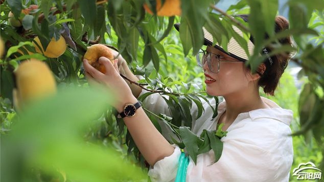 盛夏時節,寶坪鎮的700余畝桃園迎來豐收盛景。飽滿的蟠桃、金黃的鮮桃綴滿枝頭,累累果實壓彎了枝條,在綠葉掩映下格外誘人。