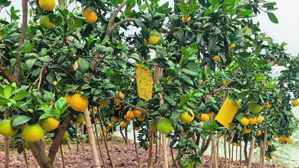 近日,在盤龍街道活龍社區的連片柑橘園中,農技人員正在安裝“柑橘木虱智能檢測儀”。