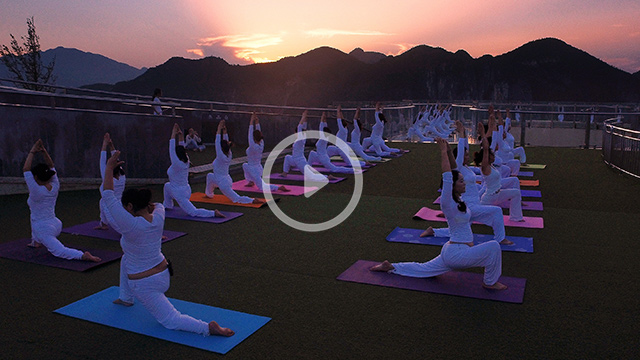 瑜伽愛好者齊聚云端廊橋 上演空中瑜伽秀